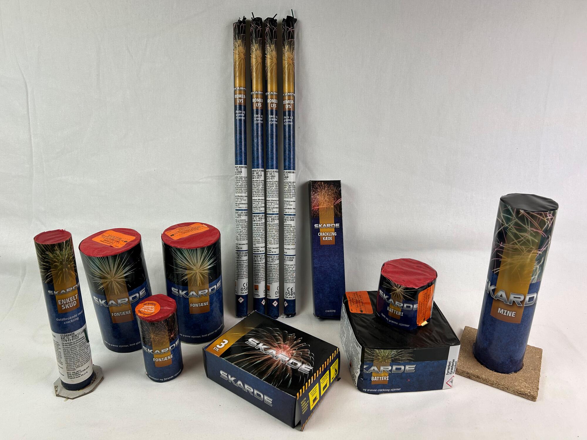 Indeholder crackling kæde, fontæner, batterier og romerlys